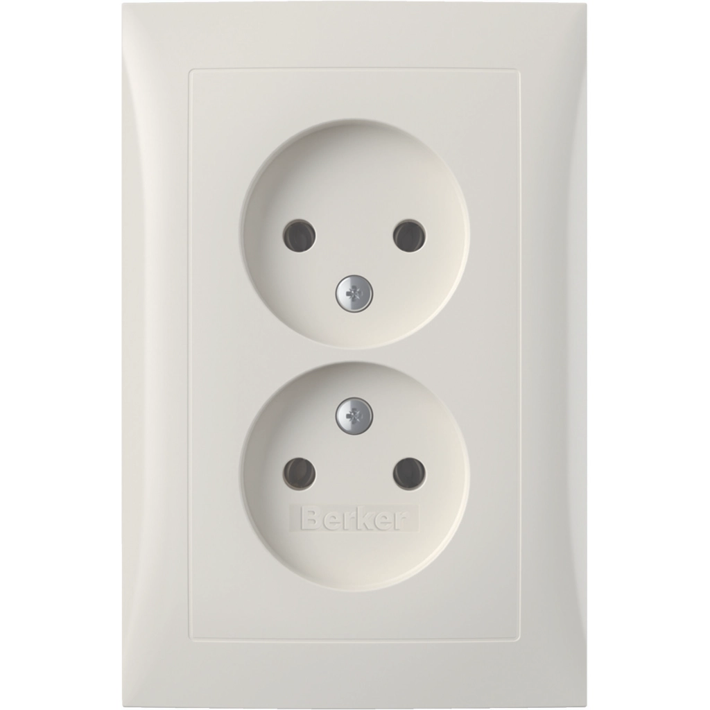 Hager Berker dubbel stopcontact zonder randaarde met verhoogde aanraakbeveiliging, S1, wit glans. Geschikt voor enkele inbouwdoos.