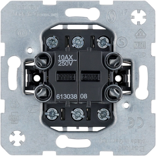 Hager Berker 2-voudige wisselschakelaar (wissel-wisselschakelaar), toepasbaar in hotelschakelingen, 10 A. Zonder klauwbevestiging (spreidklemmen). Excl. schakelwip en afdekraam.