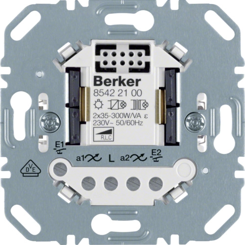 Hager Berker 2-voudige tastdimmer (serietastdimmer) voor LED-, halogeen- en gloeilampen (230 V en 12 V bij halogeen). Zie omschrijving voor de max. belasting. Fase-aan/-afsnijding (in te stellen bij de afdekking). Geschikt voor wisselschakeling*. Excl. knop en afdekraam.