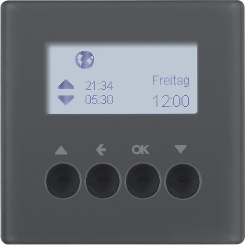 Hager Berker schakelklok opzetmodule voor jaloeziebesturing, Q1/Q3/Q7, antraciet mat. Handmatige, tijdgestuurde en automatische jaloezie- en rolluikbediening. Niet geschikt voor verlichting. Excl. binnenwerk en afdekraam.