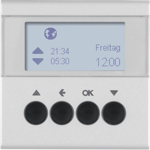Hager Berker schakelklok opzetmodule voor jaloeziebesturing, S1/B3/B7, aluminium mat. Handmatige, tijdgestuurde en automatische jaloezie- en rolluikbediening. Niet geschikt voor verlichting. Excl. binnenwerk en afdekraam.