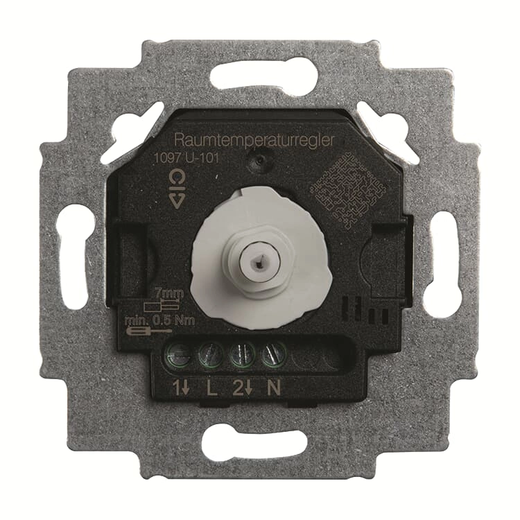 Busch-Jaeger inbouw-kamerthermostaat met wisselcontact (maakcontact (NO) 10 A en verbreekcontact (NC) 5 A). Voor verwarmingssystemen met spanningsloos gesloten ventielen en elektrische vloerverwarming. 230 V. Met externe ingang voor temperatuurverlaging.