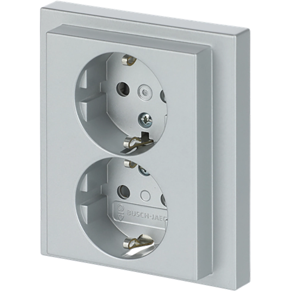 Busch-Jaeger dubbel stopcontact met randaarde en verhoogde aanraakbeveiliging, Future Linear, aluzilver mat. Geschikt voor enkele inbouwdoos.