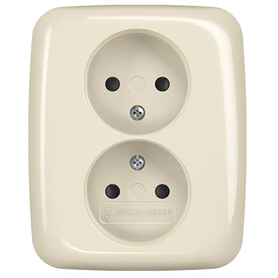 Busch-Jaeger dubbel stopcontact zonder randaarde met verhoogde aanraakbeveiliging, Standaard SI. Geschikt voor enkele inbouwdoos.