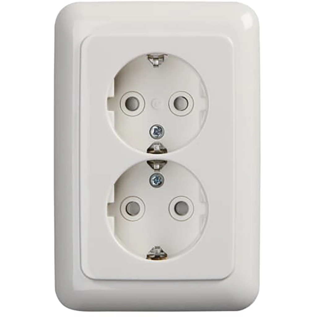 Dubbele wandcontactdoos met randaarde en Safety+ (kinderbeveiliging). Kan alleen toegepast worden in speciale ovale inbouwdozen, bijvoorbeeld type H140, H150, AT1139.