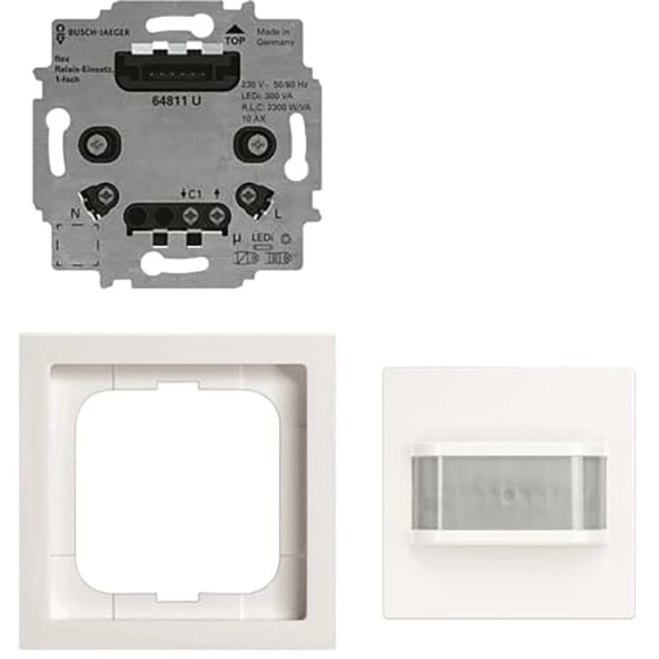 Busch-Jaeger Future Linear studiowit glans inbouw bewegingsmelder. ?Complete set, bestaat uit: relaissokkel flex 1-voudig 64811 U (nuldraad vereist), wachter 180 flex Basic-sensor met selectlens 64761-84 en een enkelvoudig afdekraam 1721-184K. Zowel de helderheidsschakeldrempel als de uitschakelvertraging kan worden ingesteld. Uitgang: 1 maakcontact (potentiaalgebonden). Eventueel uit te breiden met een nevenpostsokkel flex 64891 U of een pulsdrukker.