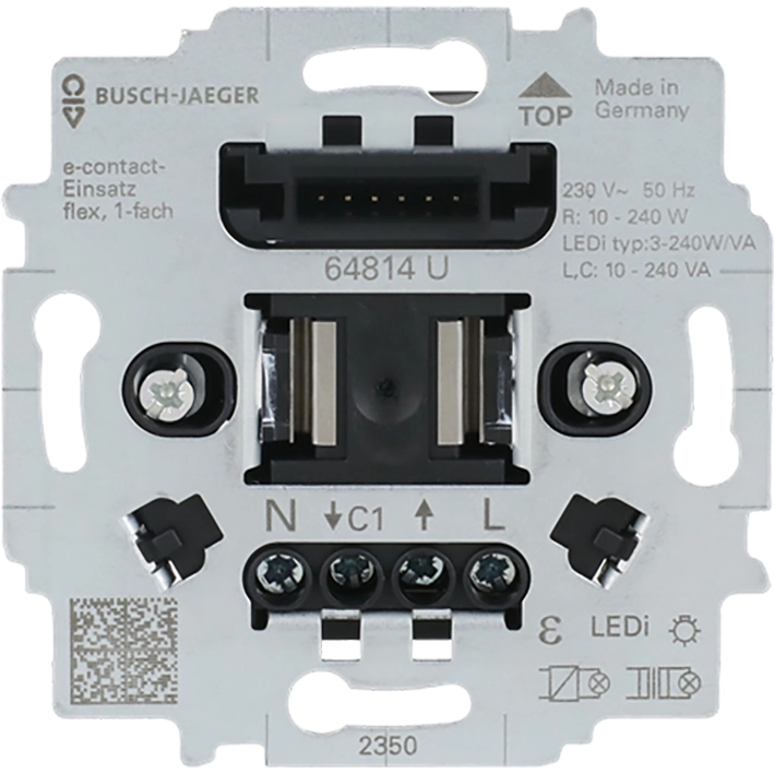 Busch-Jaeger e-contactsokkel flex 1-voudig, onderdeel van het Busch-flexTronics®-systeem. Voor het schakelen van verlichting, nuldraad niet verplicht maar bij lage belastingen (minder dan 10 watt) wel aanbevolen. Combineerbaar met nevenpostsokkel 64891 U of impulsdrukker. Min. diepte van de inbouwdoos: 25 mm. Nom. spanning: 230 V.
