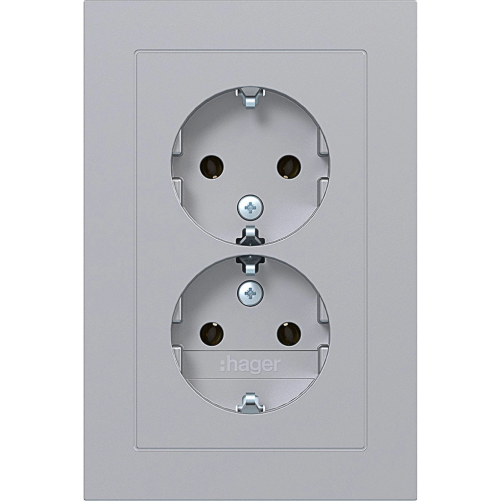 Hager Berker dubbel stopcontact met randaarde. Met volle afdekplaat, A.1, titaan metallic. Gelakt thermoplast. Geschikt voor een anderhalve (ovale) inbouwdoos.