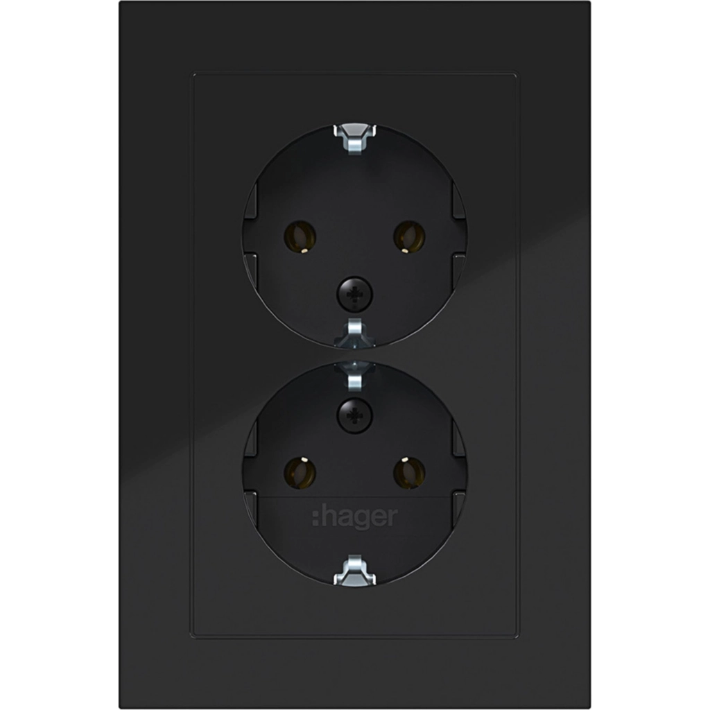 Hager Berker dubbel stopcontact met randaarde. Met volle afdekplaat, A.1, nachtzwart glans. Geschikt voor een anderhalve (ovale) inbouwdoos.