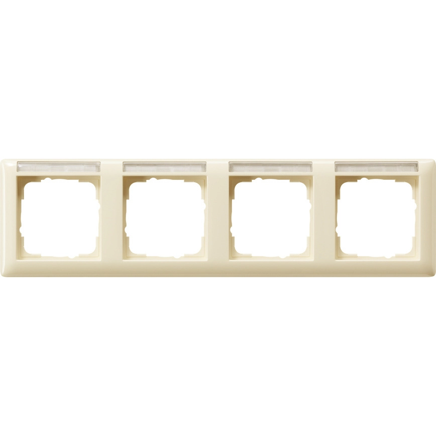 Gira 4-voudig afdekraam horizontaal met tekstkader, Standaard 55, crème glans. Afmetingen (buitenmaat): 80,7 x 294,6 x 11,4 mm.