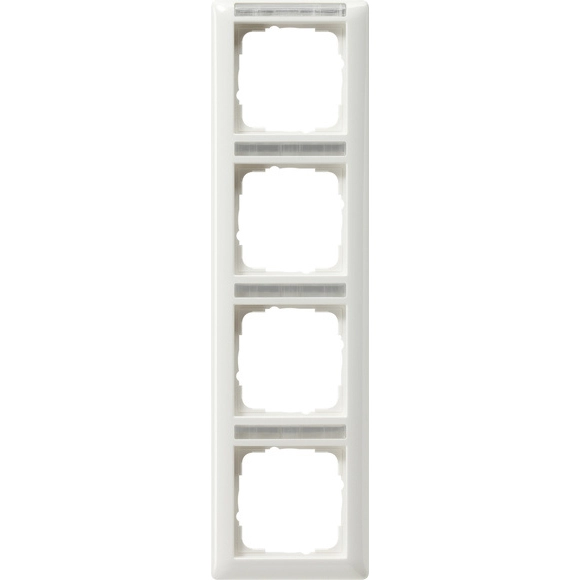 Gira 4-voudig afdekraam verticaal met tekstkader, Standaard 55, wit glans. Afmetingen (buitenmaat): 80,7 x 294,6 x 11,4 mm.
