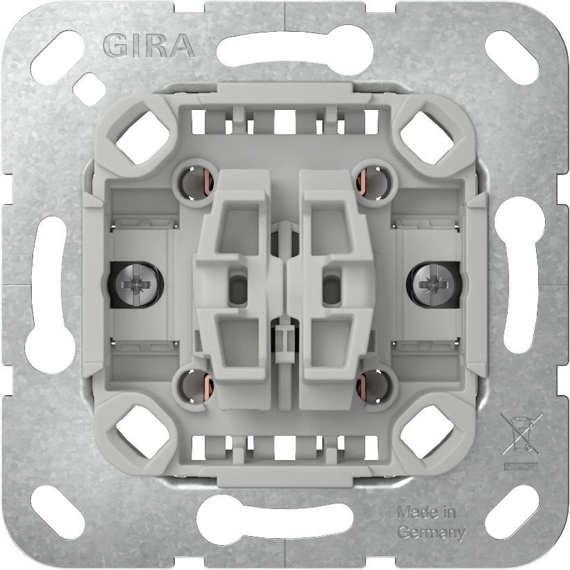 Gira seriepulsdrukker met wisselcontact, voorzien van klauwbevestiging/spreidklemmen. Afdekken met schakelwip en afdekraam.