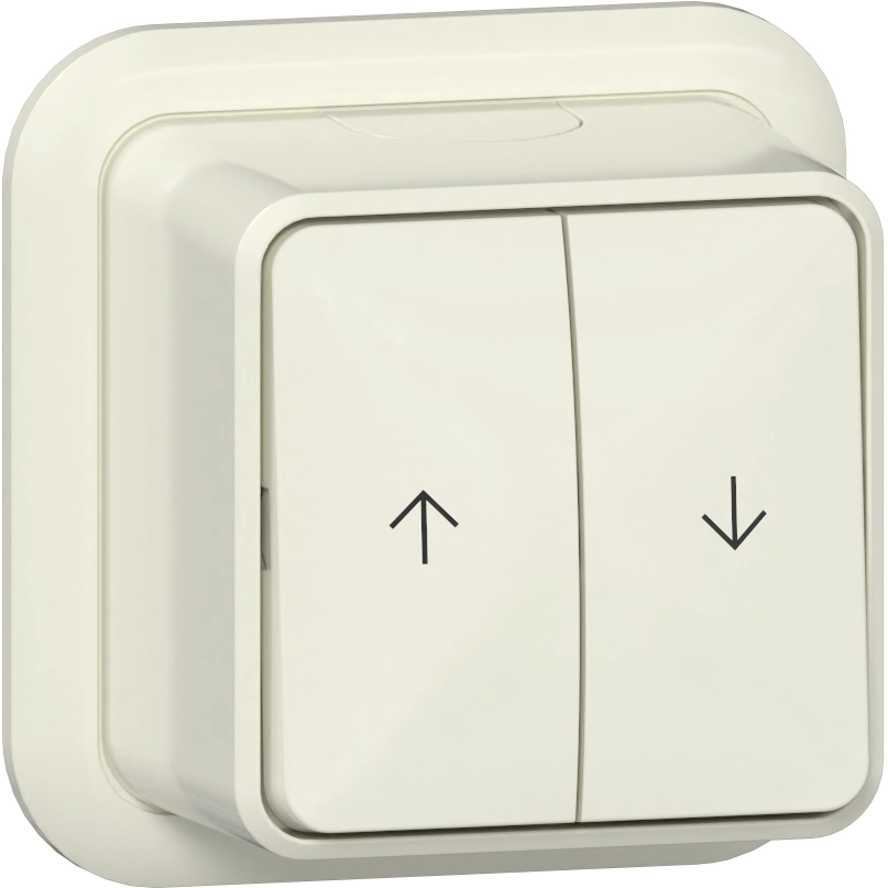 Gira opbouw jaloezieschakelaar, 10A, IP20, crème. Te gebruiken voor het bedienen van een rolluik/jaloezie. Compleet met montageplaat en adapter K/P25.