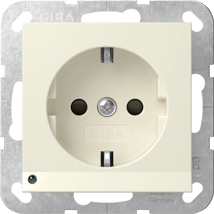 Gira wandcontactdoos randaarde met verhoogde aanraakbeveiliging en LED-oriëntatielicht, Systeem 55, crème glans. Met dag/nacht sensor.