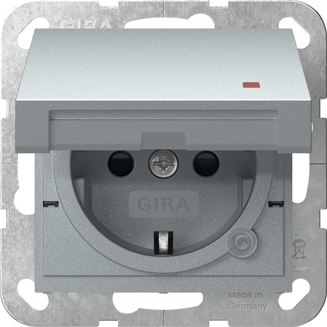 Gira stopcontact randaarde, verhoogde aanraakbeveiliging, klapdeksel en controlelamp. Systeem 55, aluminium mat.