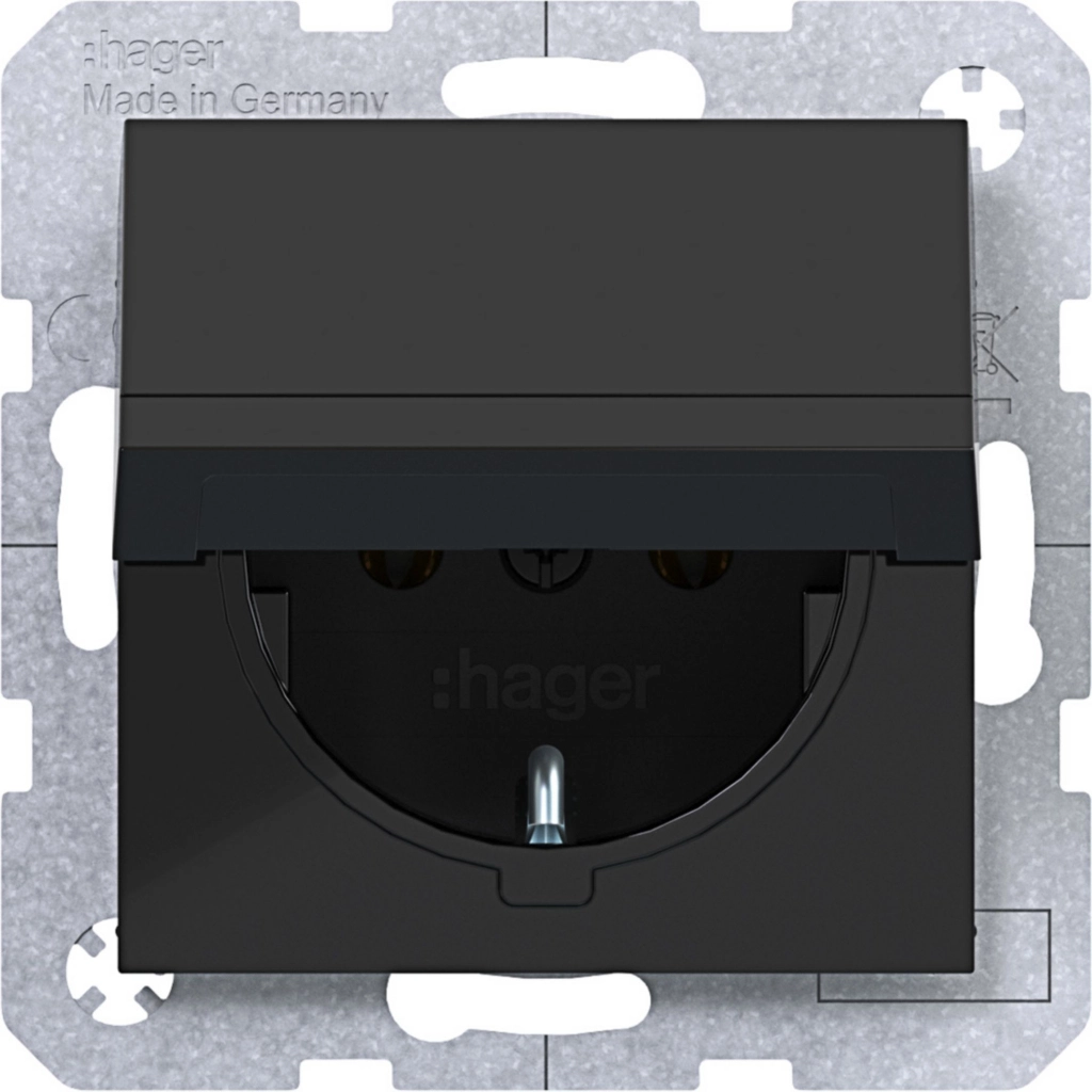 Hager Berker randaarde stopcontact met klapdeksel, A.1/A.8/C.1/C.8, nachtzwart glans. Met klauwbevestiging/spreidklemmen. Excl. afdekraam.