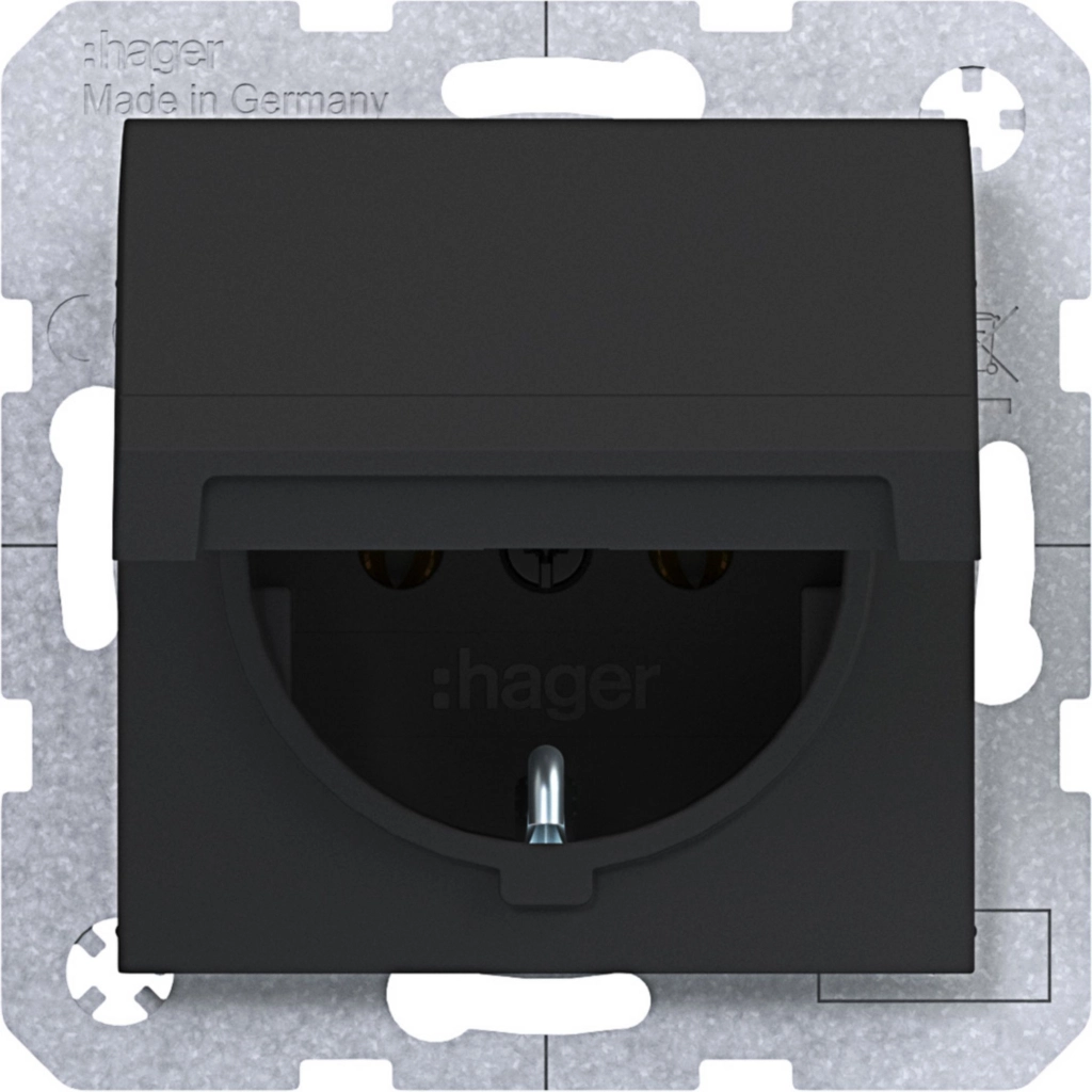 Hager Berker randaarde stopcontact met klapdeksel, A.1/A.8/C.1/C.8, nachtzwart mat. Met klauwbevestiging/spreidklemmen. Excl. afdekraam.