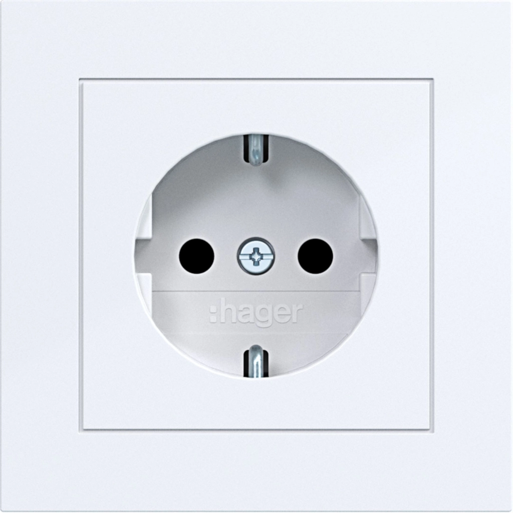 Hager Berker randaarde stopcontact met verhoogde aanraakbeveiliging en volle afdekplaat, voor afzonderlijke montage. Met klauwbevestiging/spreidklemmen. Incl. afdekraam A.1, lichtwit glans.