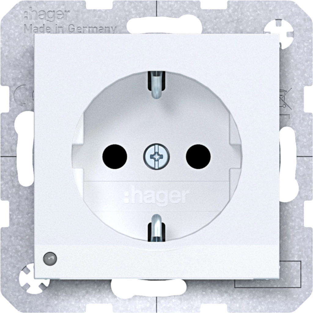 Hager Berker randaarde stopcontact met verhoogde aanraakbeveiliging en LED-oriëntatielicht., A.1/A.8/C.1/C.8, lichtwit mat. Met klauwbevestiging/spreidklemmen. Excl. afdekraam.