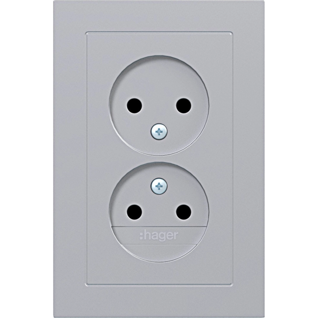 Hager Berker dubbel stopcontact zonder randaarde met verhoogde aanraakbeveiliging. Met volle afdekplaat, A.1, titaan metallic. Gelakt thermoplast. Geschikt voor enkele inbouwdoos.