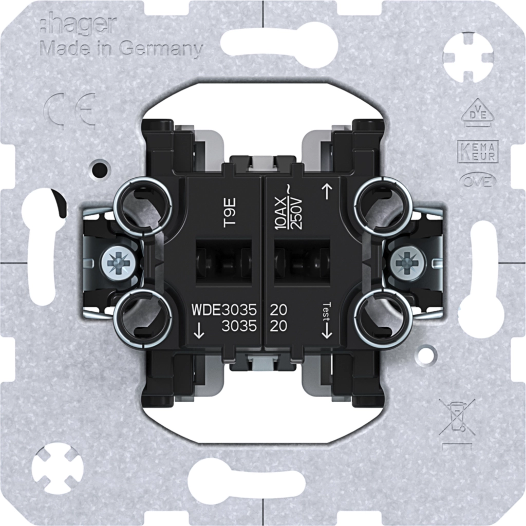 Hager Berker jaloezieschakelaar 10 AX met vergrendeling tegen gelijktijdig indrukken. Geschikt voor jaloezieën, rolluiken en markiezen. Met klauwbevestiging. Excl. schakelwip en afdekraam.