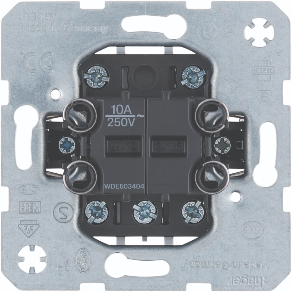 Hager Berker dubbele impulsdrukker (groepen-seriepulsdrukker) met vier maakcontacten, een gemeenschappelijke ingang en nulstand, 10 A. Ook geschikt als jaloezie-seriepulsdrukker. Met klauwbevestiging (spreidklemmen). Excl. schakelwip en afdekraam.