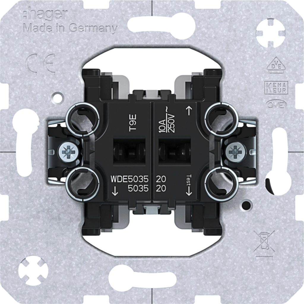 Hager Berker jaloezie-pulsdrukker 10 AX met vergrendeling tegen gelijktijdig indrukken. Geschikt voor jaloezieën, rolluiken en markiezen. Met klauwbevestiging. Excl. schakelwip en afdekraam.