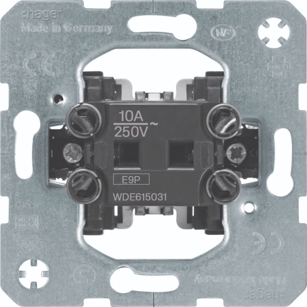 Hager Berker standaard enkelvoudige pulsdrukker met maakcontact, 10 A. Zonder klauwbevestiging (spreidklemmen). Excl. schakelwip en afdekraam.