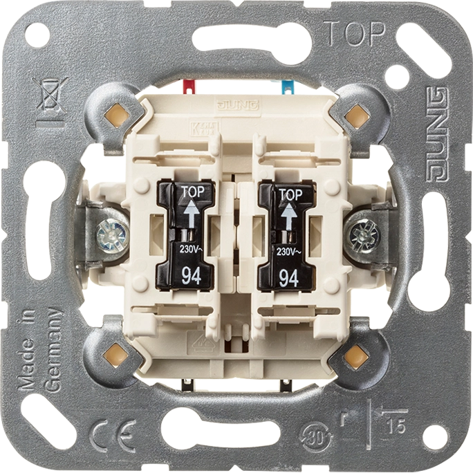 JUNG serieschakelaar met controleverlichting (vereist nuldraad), 10A/250V AC, voor het schakelen van 2 lichtpunten vanaf 1 plek. Bedrading aansluiten met insteekklemmen. Excl. schakelwip en afdekraam. Met klauwbevestiging.