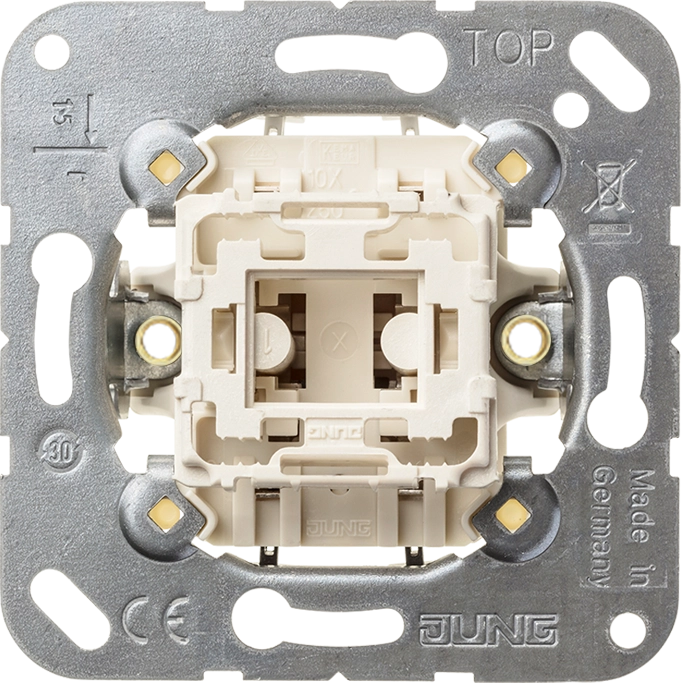 JUNG kruisschakelaar, 10A/250V AC, geschikt voor gebruik tussen twee wisselschakelaars in een hotelschakeling. Bedrading aansluiten met insteekklemmen. Excl. schakelwip en afdekraam. Zonder klauwbevestiging.