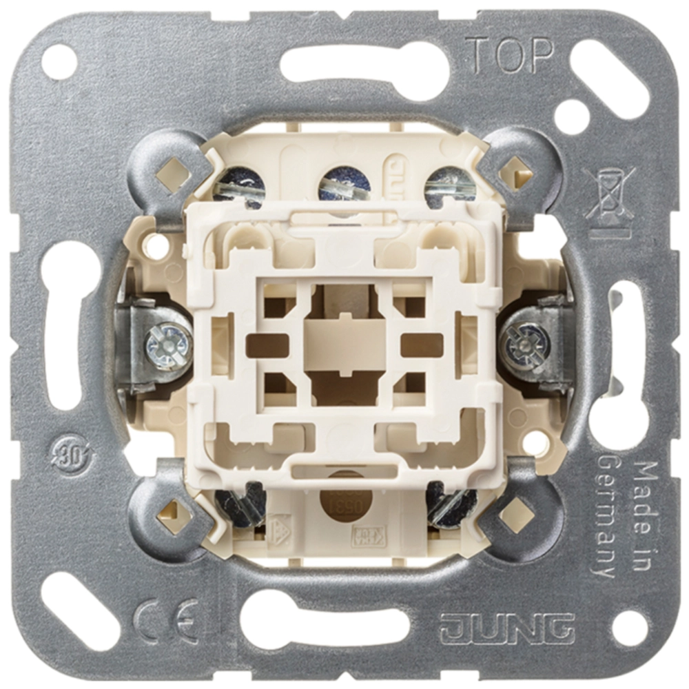 JUNG 1-voudig impulsdrukker met 2x2 maakcontacten en nulstand, 10A 250V AC. Bij indrukken van de bovenste of onderste helft sluiten beide contacten tegelijkertijd. Excl. schakelwip en afdekraam (alleen geschikt voor de CD - en LS range*). Bedrading aansluiten met schroefklemmen. Met klauwbevestiging.