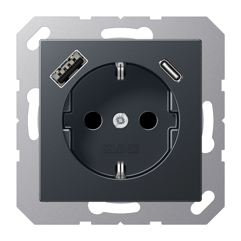 JUNG stopcontact met randaarde, verhoogde aanraakbeveiliging en USB-poorten type A en C. A-range, antraciet mat. Geschikt voor inbouwdozen met een minimale diepte van 57 mm. Thermoplast (mat gelakt). Excl. afdekraam.