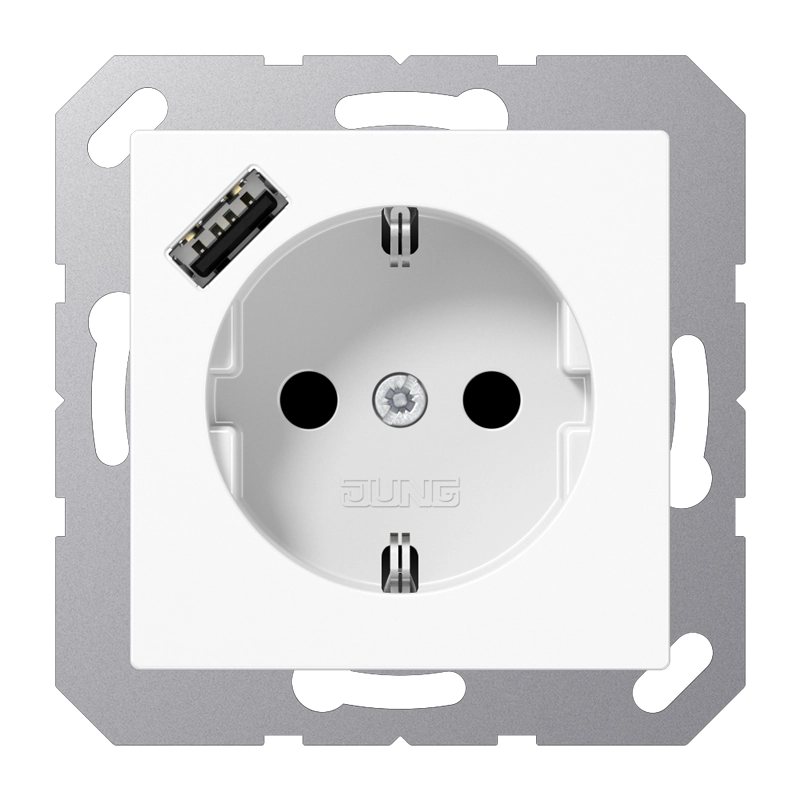 JUNG stopcontact met randaarde, verhoogde aanraakbeveiliging en één USB-A poort. A-range, alpine wit. Geschikt voor inbouwdozen met een minimale diepte van 57 mm. Thermoplast (hoogglans). Excl. afdekraam.
