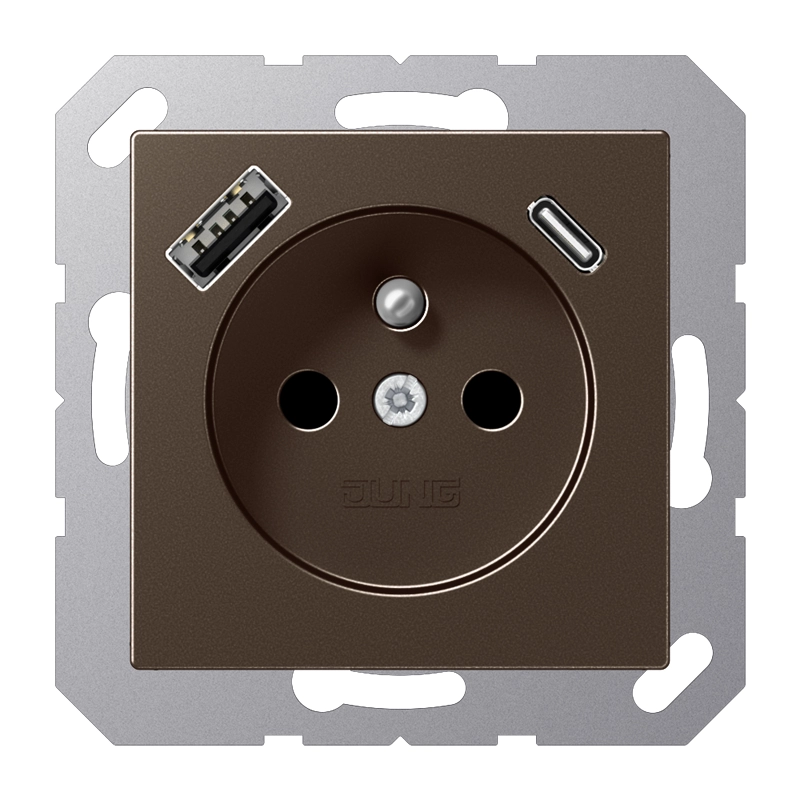 JUNG stopcontact met penaarde (België), verhoogde aanraakbeveiliging en USB-poorten type A en C. A-range, mokka. Geschikt voor inbouwdozen met een minimale diepte van 57 mm. Thermoplast (gelakt). Excl. afdekraam.