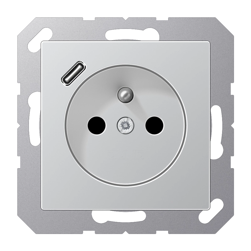 JUNG stopcontact met penaarde (België), verhoogde aanraakbeveiliging en één USB-C poort. A-range, aluminium. Geschikt voor inbouwdozen met een minimale diepte van 57 mm. Thermoplast (gelakt). Excl. afdekraam.