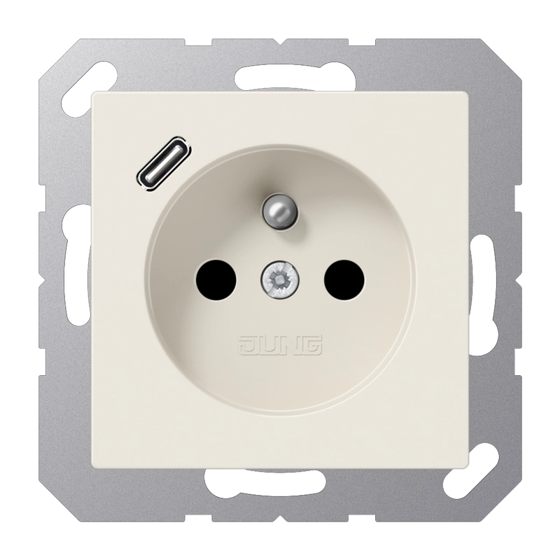 JUNG stopcontact met penaarde (België), verhoogde aanraakbeveiliging en één USB-C poort. A-range, crème. Geschikt voor inbouwdozen met een minimale diepte van 57 mm. Thermoplast (hoogglans). Excl. afdekraam.