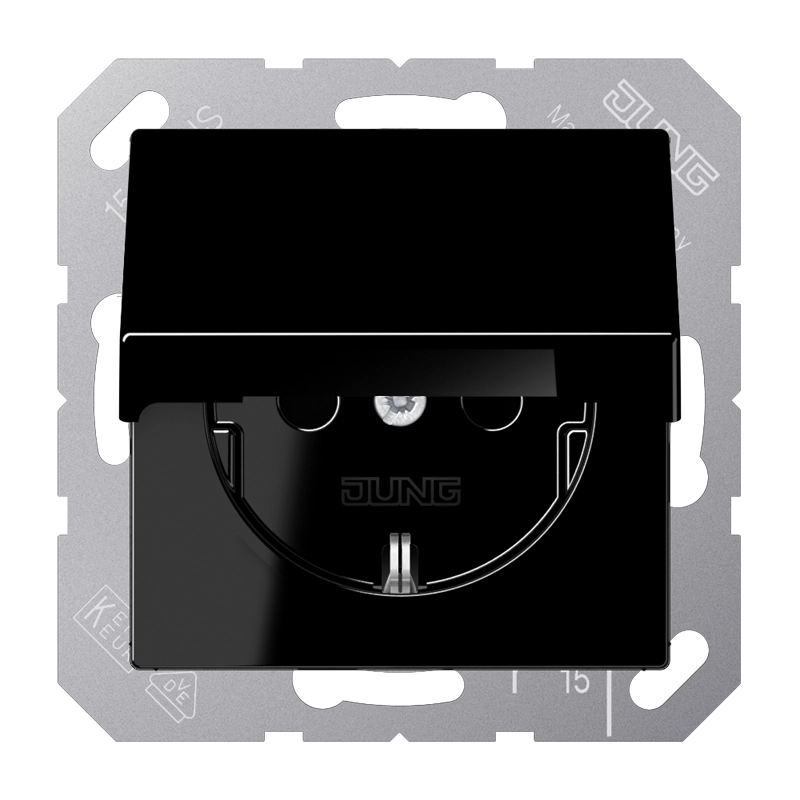 JUNG stopcontact met randaarde, verhoogde aanraakveiligheid en klapdeksel, A-range, zwart. Bedrading aansluiten met insteekklemmen, de draagring is aangesloten op de aardverbinding. Thermoplast (hoogglans). Excl. afdekraam.