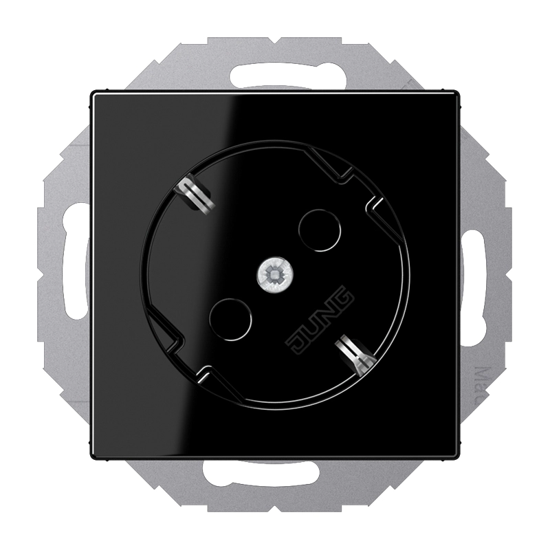 JUNG stopcontact 45 graden gedraaid met randaarde, A-range, zwart. Bedrading aansluiten met insteekklemmen. Duroplast, zeer krasvast en glanzend. Excl. afdekraam.