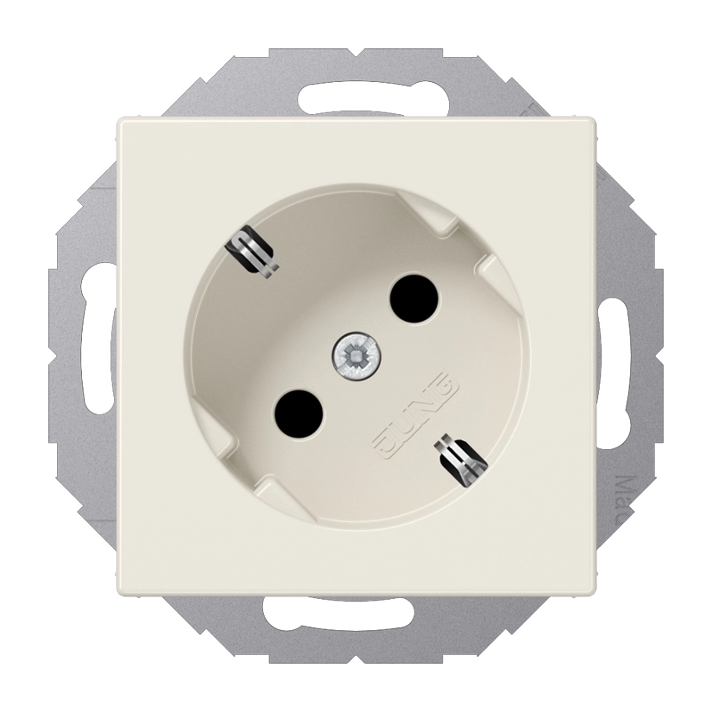 JUNG stopcontact 45 graden gedraaid met randaarde, A-range, crème. Bedrading aansluiten met insteekklemmen. Duroplast, zeer krasvast en glanzend. Excl. afdekraam.