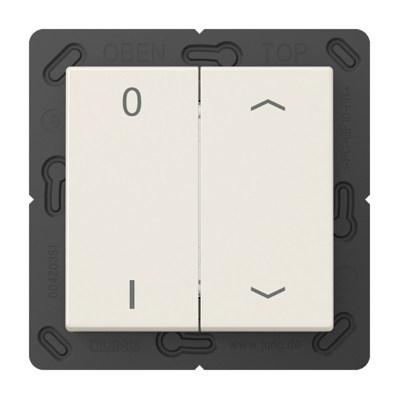 JUNG 4-kanaals wandzender met 0-1 en pijlsymbolen zonder netvoeding of batterijen. A-range, crème. Stuurt schakel-, dim- of jaloeziecommando’s naar EnOcean-ontvangers. Thermoplast (hoogglans). Excl. afdekraam.