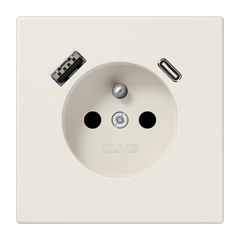 JUNG stopcontact met penaarde (België), verhoogde aanraakbeveiliging en USB-poorten type A en C. LS 990, crème. Geschikt voor inbouwdozen met een minimale diepte van 57 mm. Thermoplast (hoogglans). Excl. afdekraam.