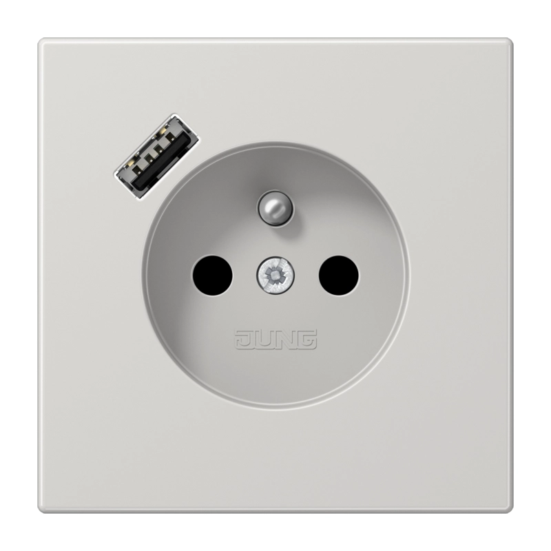 JUNG stopcontact met penaarde (België), verhoogde aanraakbeveiliging en één USB-A poort. LS 990, lichtgrijs. Geschikt voor inbouwdozen met een minimale diepte van 57 mm. Thermoplast (hoogglans). Excl. afdekraam.
