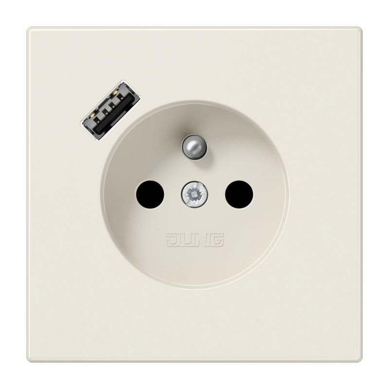 JUNG stopcontact met penaarde (België), verhoogde aanraakbeveiliging en één USB-A poort. LS 990, crème. Geschikt voor inbouwdozen met een minimale diepte van 57 mm. Thermoplast (hoogglans). Excl. afdekraam.