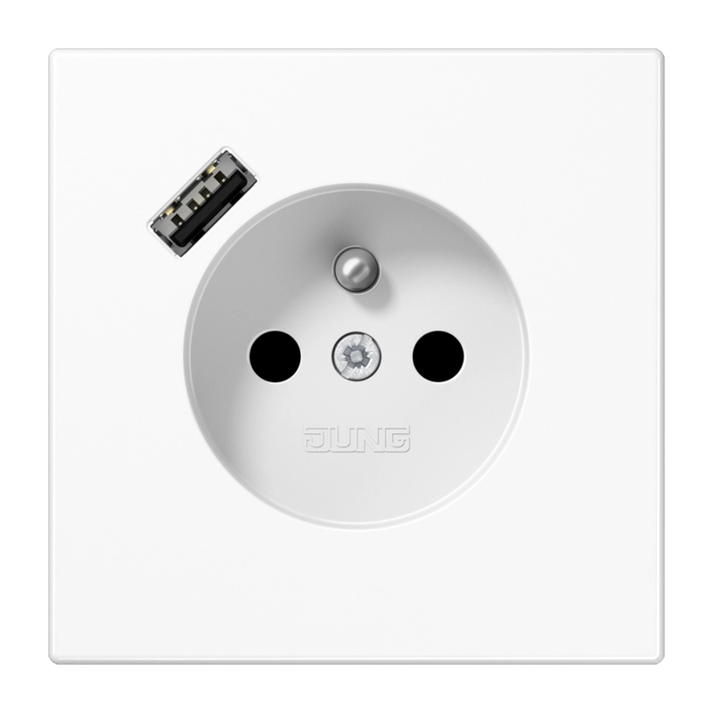 JUNG stopcontact met penaarde (België), verhoogde aanraakbeveiliging en één USB-A poort. LS 990, alpine wit. Geschikt voor inbouwdozen met een minimale diepte van 57 mm. Thermoplast (hoogglans). Excl. afdekraam.