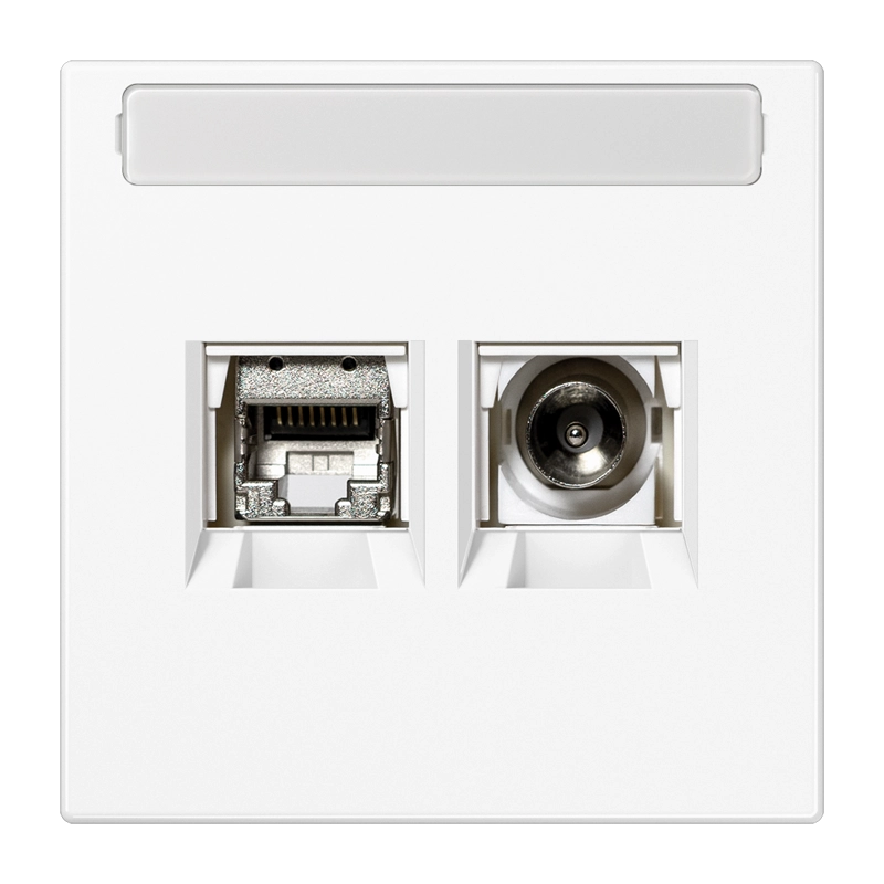 JUNG communicatie-wandcontactdoos met RJ45 Cat.6A-aansluiting en COAX. Ideaal voor netwerk- en tv-aansluitingen (ethernet, internet, telefonie, digitale TV) in één compacte oplossing. Bespaart ruimte, installatietijd en bekabeling.