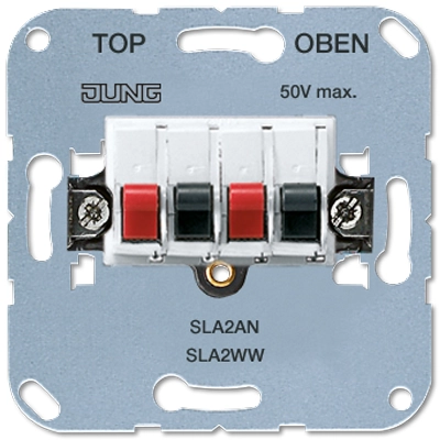 JUNG stereo luidspreker-aansluitdoos met twee rode en twee zwarte klemmen (schroefcontacten aan de binnenzijde). Geschikt voor luidsprekerkabels tot 10 mm². Spanning: 25-50 V DC. Excl. afdekking en adekraam.