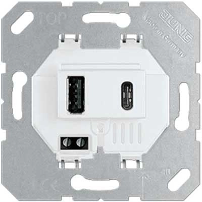 JUNG USB laadcontactdoos met 1 USB-poort type A en 1 USB-poort type C. Gelijktijdige aansluiting van 2 toestellen mogelijk. Laadstroom: max. 3000 mA. Kleur: wit. Excl. centraalplaat en afdekraam.