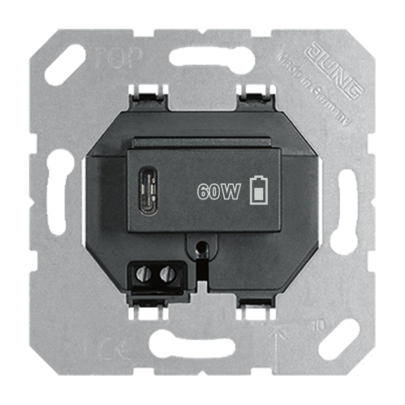 JUNG USB-laadcontactdoos met 1 USB-C poort en snellaadfunctie (Power Delivery). Maximaal laadvermogen: 60 W. Kleur: zwart. Excl. afdekking en afdekraam.