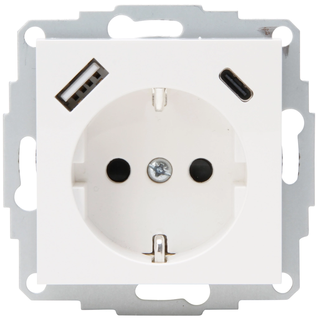 Kopp wandcontactdoos met randaarde, verhoogde aanraakbeveiliging en USB-A en USB-C poorten, HK07, Athenis helder wit glans (RAL 9010).