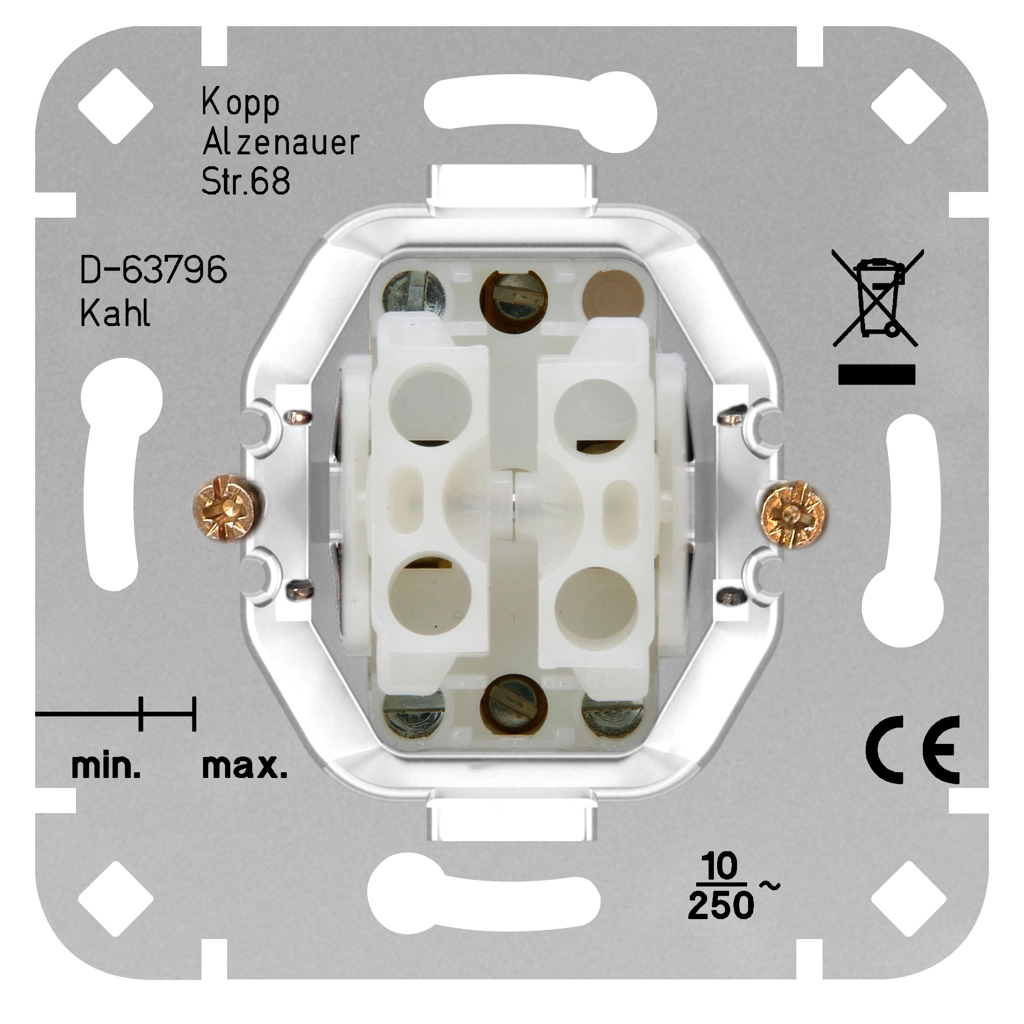 Kopp seriedrukcontact (dubbele pulsdrukker) met 2 maakcontacten, 10 A. Met klauw-/schroefbevestiging. Excl. schakelwip en afdekraam.